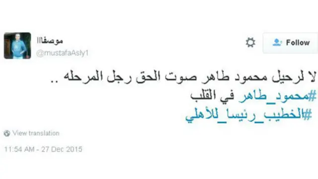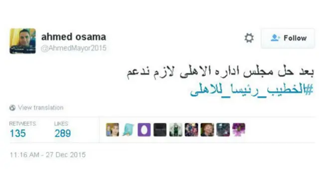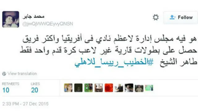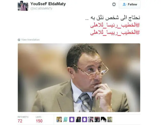 دشن مغردون مصريون هاشتاغ #الخطيب_رئيسا_للأهلي، للمطالبة بتولي اللاعب المصري الدولي السابق رئاسة النادي الأهلي بعد قرار محكمة القضاء الإداري بحل مجلس إدارة النادي.