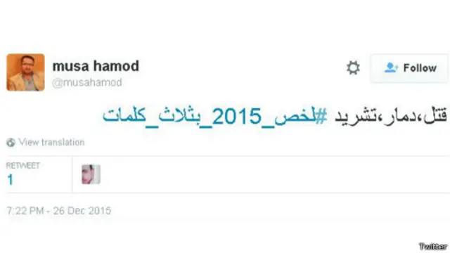 ومع قرب نهاية العام الجاري، دون مغردون أهم ما ميز سنة 2015، من خلال تدشين هاشتاغ #لخص_2015_بثلاث_كلمات، الذي ظهر في أكثر من 40 ألف تغريدة.