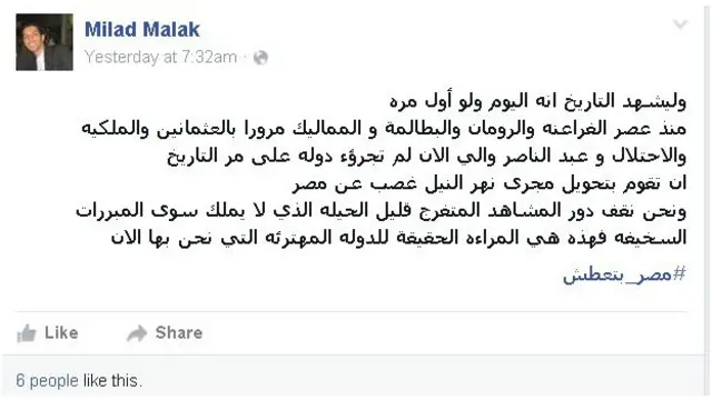 وكتبت أسماء أبو الزين على فيسبوك : "المجري متحول منذ بداية إنشاء السد ...السد على المجري الطبيعي، وتم التحويل من سنة تقريبا .. هذا خبر ليس جديدا."