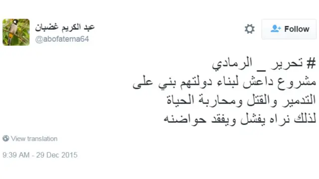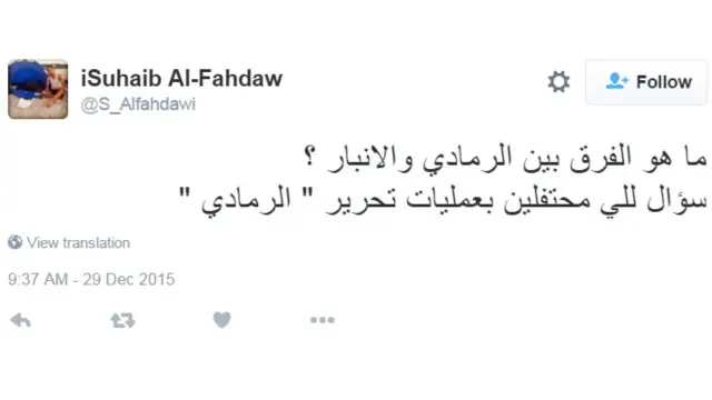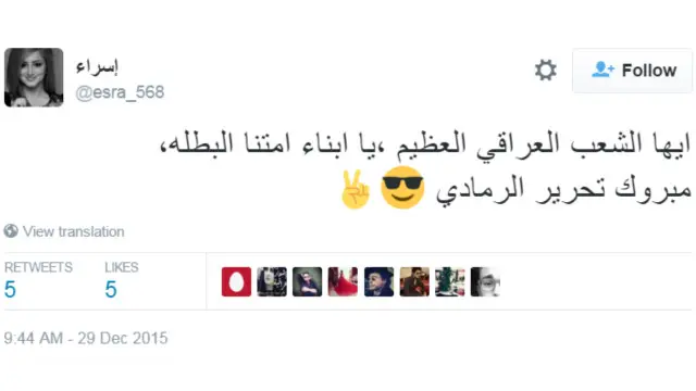 وظهر هاشتاغ #الرمادي و#تحرير _الرمادي في أكثر من 37 ألف تغريدة، نشر خلالها مغردون صورا لمسيرات جابت شوارع العراق فرحا، مشبدين بجهود الجيش العراقي.