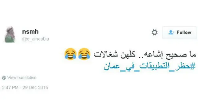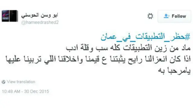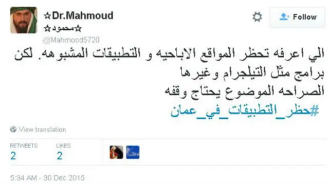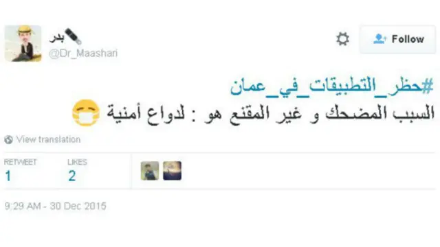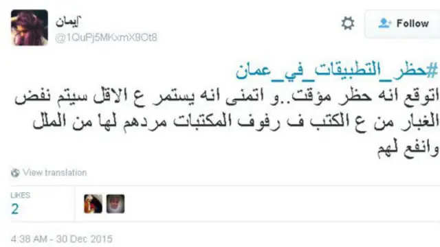 وحقق هاشتاغ #حظر_التطبيقات_في_عمان نسبة مشاركة واسعة، إذ ظهر فيما يقرب من ألفي تغريدة في أقل من 24 ساعة.
