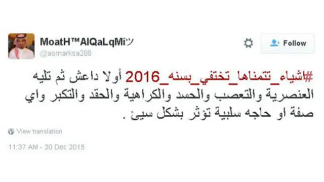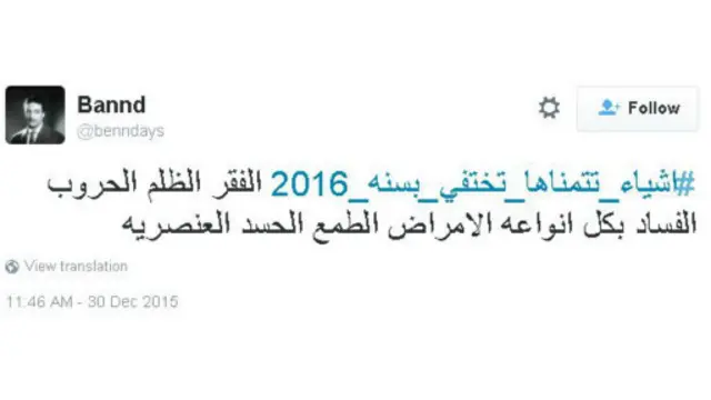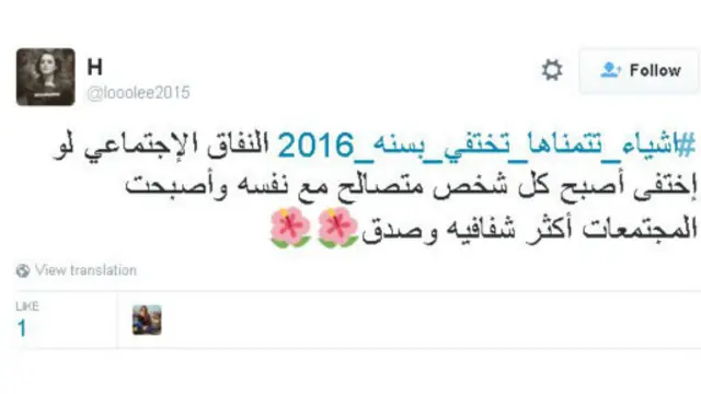 ونعرض فيما يلي نماذج مما جاء في تعليقات المغردين عبر هاشتاغ #اشياء_تتمناها_تختفي_بسنه_2016، الذي ظهر في أكثر من 22 ألف تغريدة: