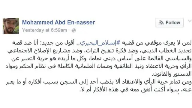 وكانت محكمة مصرية قضت بحبس البحيري لمدة عام بعد إدانته بازدراء الدين الإسلامي. وكان بحيري ردد في عدة لقاءات تلفزيونية ما اعتبره بعض علماء الدين خطاب فتنة تحريضي يطعن في العقيدة الإسلامية ويتهم علماء وأئمة لمذاهب فقهية بتحريف نصوص.