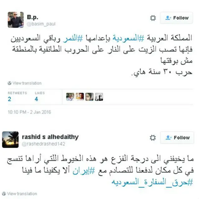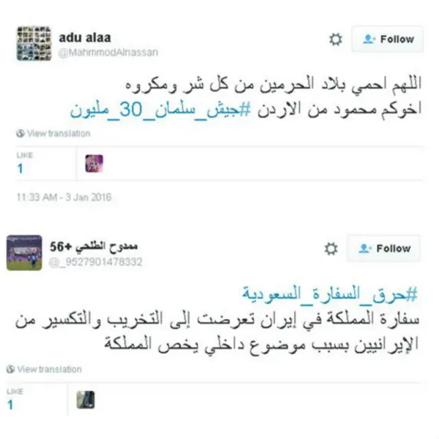 كما استنكر مغردون عرب ما وصفوه بالتدخلات الإيرانية في شؤون السعودية و أدانوا الهجمات على السفارة السعودية في طهران من خلال تدشين هاشتاغ #حرق_السفاره_السعوديه ،#كلنا_بلاد_الحرمين، و#مصر_تدعم_السعوديه للتعبير عن دعمهم للسعودية. وطالبوا إيران بالكف عن التدخل في الشؤون الدول العربية، على حد قولهم.