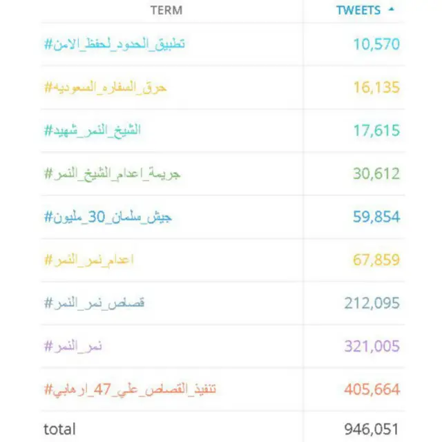 قد احتل هاشتاغ #نمر_النمر، وهاشتاغ #الشيخ_النمر مركزا متقدما في لائحة الهاشتاغات الأكثر تداولا في عدد من الدول العربية.