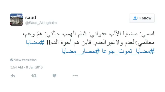 استمر مستخدمو تويتر بالتعليق على الأزمة الانسانية والحصار على بلدة مضايا السورية وكان تركيز العديد على الجهود الدولية لإدخال المساعدات الإنسانية والمواد الغذائية الى البلدة.