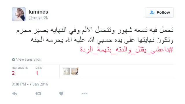 وننتقل الى قضية أخرى، إذ تداول مغردون هاشتاغ بعنوان #داعشي_يقتل_والدته_بتهمه_الرده تعليقا على نبأ أفاد بأن شاب ينتمي لتنظيم الدولة الإسلامية أقدم على إعدام والدته، على خلفية اتهامها بـ "الردة" عن الإسلام لأنها دعته إلى ترك التنظيم في مدينة الرقة السورية.