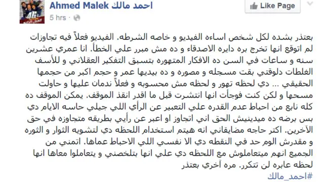 قام الشاب الآخر الذي اشترك في تصوير الفيديو، الممثل أحمد مالك، بتقديم اعتذار مطول عبر صفحته على فيسبوك، وقال فيه: "انا عمري عشرين سنه و ساعات في السن ده الافكار المتهورة بتسبق التفكير العقلاني و للأسف الغلطات دلوقتي بقت مسجلة و مصورة وده بيديها عمر و حجم اكبر من حجمها الحقيقي… دي لحظه تهور و لحظة مش محسوبة وفعلاً ندمان عليها و حاولت مسحها و لكن كنت فوجأت انها انتشرت قبل ما اقدر انقذ الموقف."