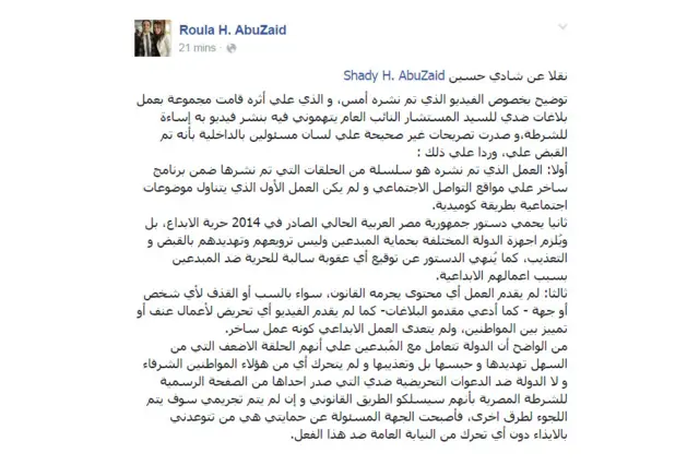 ويضيف المنشور: "لم يقدم العمل أي محتوى يجرمه القانون، سواء بالسب أو القذف ﻷي شخص أو جهة. كما أدعي مقدمو البلاغات. كما لم يقدم الفيديو أي تحريض لأعمال عنف أو تمييز بين المواطنين، ولم يتعد العمل الابداعي كونه عمل ساخر."