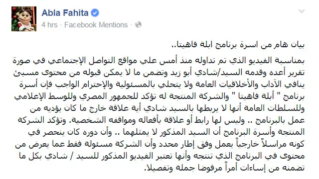 وظهر أيضا هاشتاغ #مقاطعة_برنامج_ابله_فاهيتا الذي طالب بمقاطعة البرنامج الساخر الذي يعمل به شادي كمراسل على إثر انتشار الفيديو، لتنشر صفحة البرنامج منشورا عبر فيسبوك قالت فيه "إنها لا يربطها بالسيد شادي أية علاقة خارج ما كان يؤديه من عمل بالبرنامج" وأنها "تعتبر الفيديو المذكور بكل ما تضمنه من إساءات أمراً مرفوضا جملة وتفصيلا."