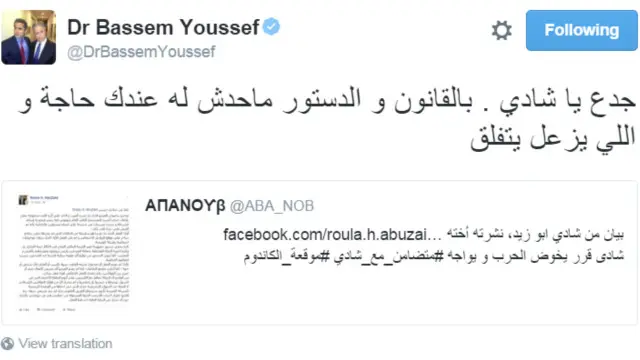 وأشاد الساخر المصري الشهير باسم يوسف بموقف شادي، واصفا إياه بالـ"جدع" في تغريدة عبر صفحته الرسمية.