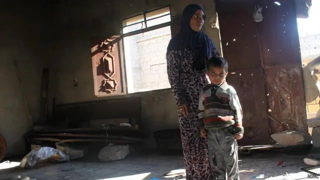 تقول أمينة إنه يصعب عليهم توفير الغذاء والدفء لأسرتهم الكبيرة. فالأسرة لا تملك أموالاً كافية لشراء الحطب للموقد أو الثياب الشتوية. ما يجعل الأمر أكثر سوءً هو الدمار الذي لحق بأحد جدران المنزل جراء تفجير في الحي.