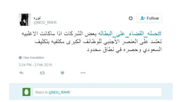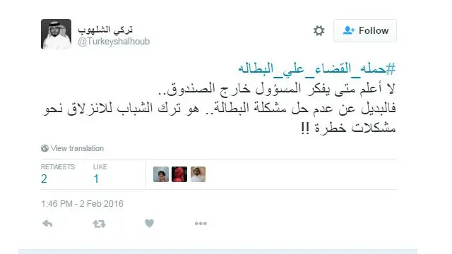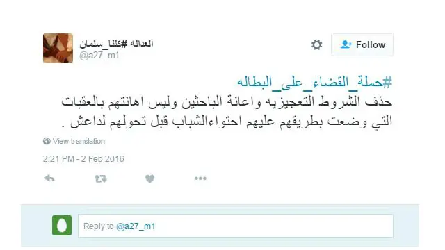 وأطلق المغردون هاشتاغ #حمله_القضاء_علي_البطاله لدعوة الحكومة السعودية إلى بذل المزيد لتوفير الوظائف للشباب لدمجهم بصورة أكبر في المجتمع ومنع انزلاقهم إلى ما وصفوها بالأفكار المتطرفة الهدامة.