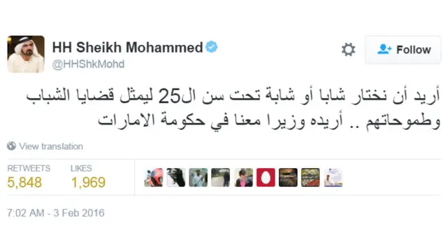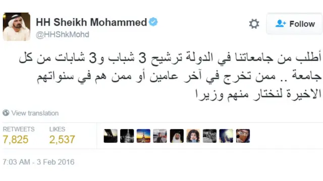 أهتم رواد مواقع التواصل في العالم العربي، وخاصة الإمارات، بدعوة حاكم دبي ورئيس الوزراء الإماراتي الشيخ محمد بن راشد، إلى تعيين أحد خريجي الجامعات المتفوقين وزيرا يمثل قضايا الشباب في البلاد، على حد وصفه.
