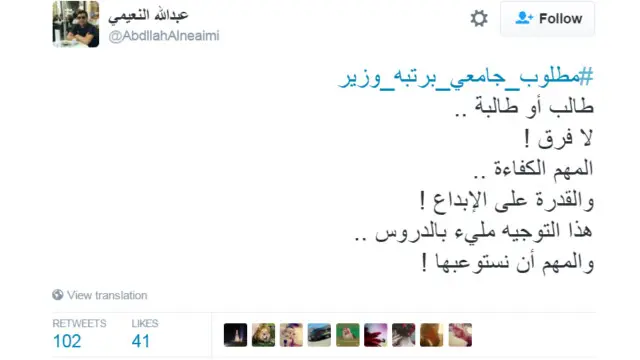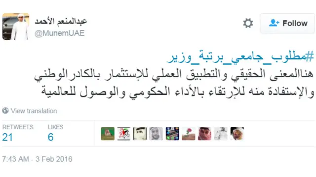 وانتشر هاشتاغ #مطلوب_جامعي_برتبة_وزير بصورة كبيرة صباح الأربعاء ليظهر في قائمة أكثر الهاشتاغات تداولا عالميا، وعبره أشاد المستخدمون بمبادرة الشيخ محمد بن راشد.
