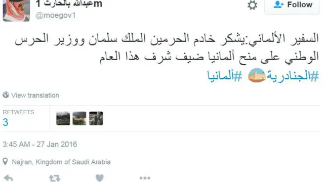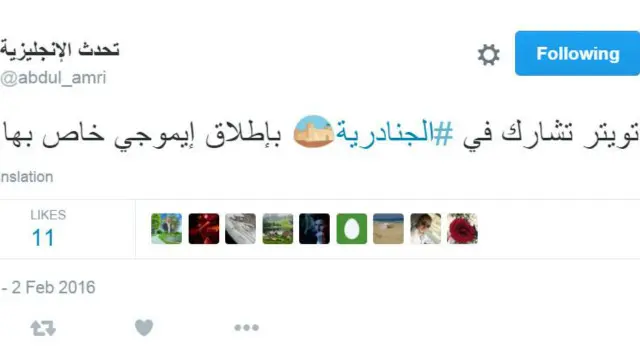 ومازلنا في السعودية حيث احتفى المغردون بتدشين موقع تويتر إيموجي، رمز تعبيري صغير على تويتر مثل القلوب والوجوه الصفراء، خاص بمهرجان الجنادرية التراثي للفنون التاريخية السعودية، والذي تقيمه المملكة كل عام.