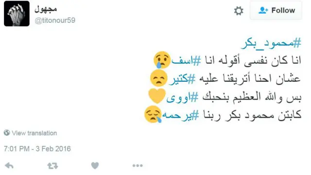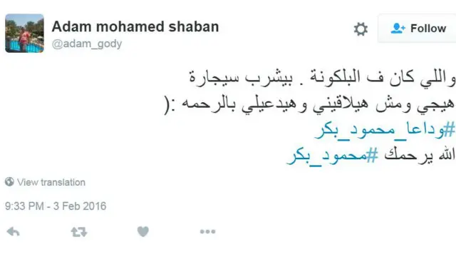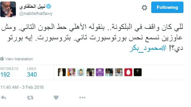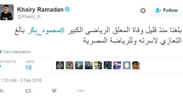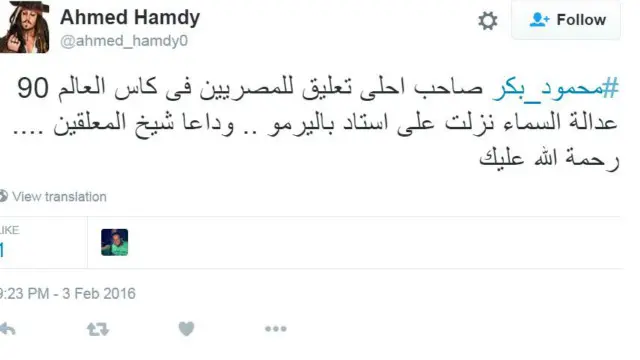 ونعى الممثل المصري الناشط على تويتر، نبيل الحلفاوي، المعلق الراحل مقتبسا بعض تعليقاته.