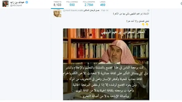 وتضمنت التغريدة، التي أعاد نشرها حساب بن زايد من حساب شخص آخر نشرها، عبارات نُسبت للكاتب والمفكر السعودي إبراهيم البليهي، تجسد وجهة نظره في طريقة حكم البلاد في المملكة، التي وفقا لما كتب في التغريدة "تنتج ثقافة معادية للحياة تحتقر الإنسان وتمعن من التخويف في المرأة".
