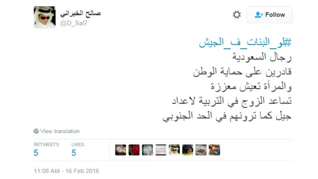 واشارت تغريدات اخرى إلى أن دور المرأة هو مساعدة الزوج في تربية الأجيال التي لاحقا "تدافع" عن البلاد.