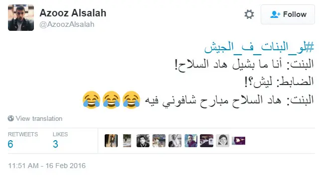 بينما غردت مستخدمة اخرى قائلة: "لو البنات سمح لهن بالإنضمام إلى الجيش كان زماني دلوقتي في مركز تدريب"
