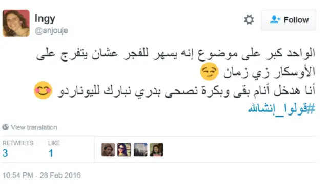 في الوقت الذي احتل فيه هاشتاغ باللغة الإنجليزية Oscars# قائمة الاهتمامات في البلدان العربية والعالم، تناول مغردون الاحتفال بتوزيع الجوائز السينمائية الشهيرة باللغة العربية تحت هاشتاغ"#الاوسكار".