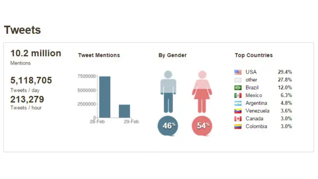 ويظهر الرسم التحليلي التالي عدد التغريدات التي وردت على هاشتاغ #Oscars بالإضافة إلى أكثر البلدان استخداما للهاشتاغ، على مدار الأربع وعشرين ساعة الماضية.