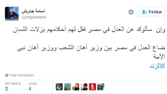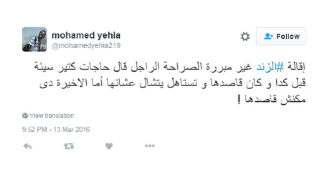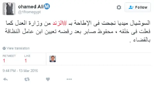 بعد إقالة وزير العدل المصري أحمد الزند من منصبه إثر تصريح اعتبر مسيئا للنبي محمد، انطلق هاشتاغ الزند ليحتل مركزا متقدما في مصر كما انطلقت هاشتاغات أخرى حول نفس الموضوع في العالم العربي مثل وزير العدل المصري واختار وظيفة للزند ومظهر شاهين ووائل الإبراشي.