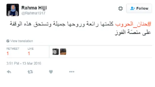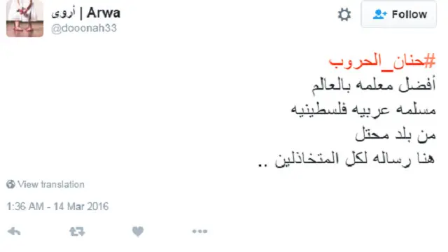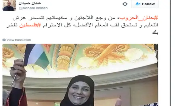بعد فوز المعلمة الفلسطينية حنان الحروب بجائزة أفضل معلم في العالم وقدرها مليون دولار والتي حصلت عليها لدورها في تعليم تلاميذ المخيمات، انطلق هاشتاغ حنان الحروب واحتل القمة في الأردن حيث أشاد المغردون بالمعلمة الفائزة.
