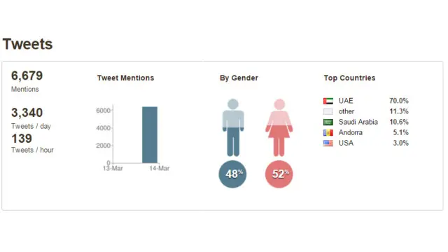 ودشن المستخدمون هاشتاغ #فقدان_المقاتله_الاماراتيه، الذي تصدر قائمة أكثر الهاشتاغات انتشارا في الإمارات صباح الاثنين، ونعرض عليكم خلال الرسم التحليلي التالي عدد التغريدات التي وردت على الهاشتاغ منذ تدشينه، بجانب أكثر الدول استخداما للهاشتاغ.