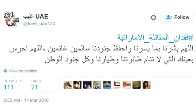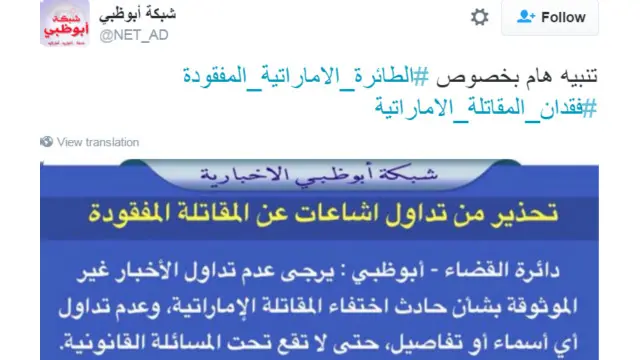 وننتقل إلى قضية اخرى كان لها اصداء واسعة على مواقع التواصل الاجتماعي في العالم العربي وخاصة الخليج صباح الاثنين، ألا وهي فقدان طائرة إماراتية مقاتلة ضمن قوات التحالف العربي في اليمن.