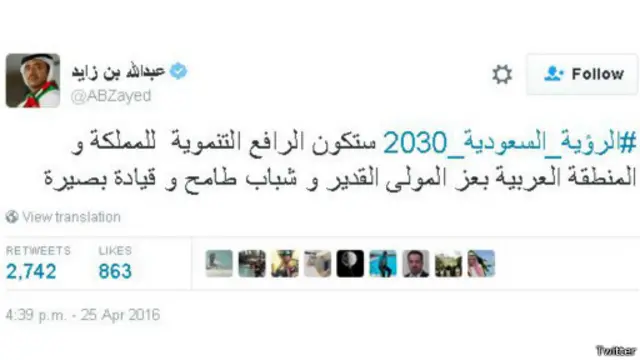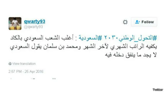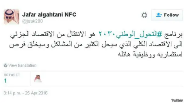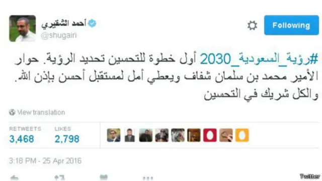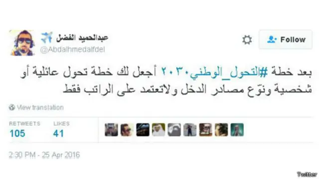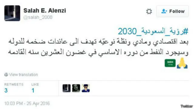وتنوعت التغريدات بين الأمل في أن توفر الرؤية مزيدا من الوظائف للمواطنين والتخوف من أن الاستغناء عن النفط سيرجع بالسلب على رفاهية المواطن السعودي، فيما تساءلت أخرى فرص نجاح هذه الخطة وصمودها في وجه التقلبات التي تشهدها المنطقة.