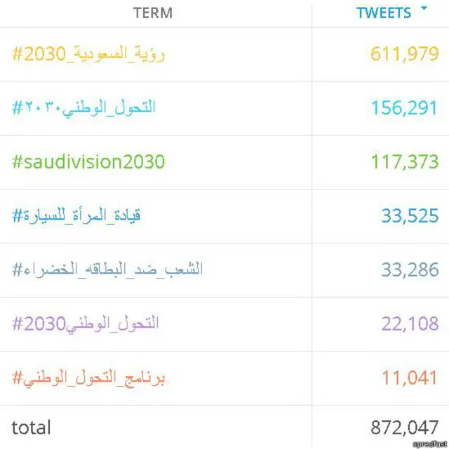 #التحول_الوطني ٢٠٣٠، #التحول_الوطني_2030 ، #رؤية_السعودية_2030، #Saudivision2030، هاشتاغات اجتاحت منصات مواقع التواصل الاجتماعي السعودية، تزامنا مع الإعلان عن برنامج التحول الوطني.