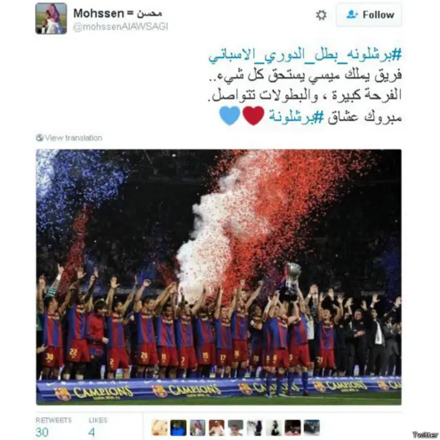 كما تربع #برشلونه_بطل_الدوري_الاسباني، على عرش الهاشتاغات الأكثر تداولا في عدد من الدول العربية بحوالي 14 ألف تغريدة. وتباهى مغردون بفوز ناديهم المفضل، حيث ازدانت تغريداتهم بصور عكست مظاهر الاحتفالات بما وصفوه بالإنجاز العظيم لفريقهم.