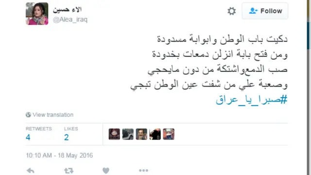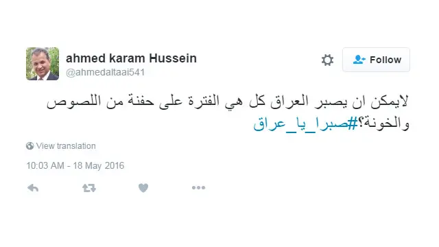 أنتشر هاشتاغ "صبرا_يا_عراق"، بعد سلسلة من التفجيرات في بغداد يوم الأمس التي أدت الى مقتل 64 شخصاً على الأقل وإصابة العشرات في التفجيرات التي وصفت بالانتحارية.