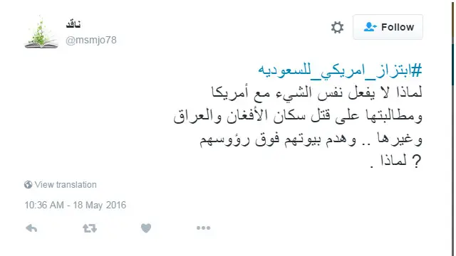 و من ضمن المواضيع الأخرى التي شغلت مستخدمي تويتر هو إقرار مجلس الشيوخ الأمريكي مشروع قانون يسمح لعائلات ضحايا هجمات 11 سبتمبر/أيلول عام 2001 بمقاضاة الحكومة السعودية.