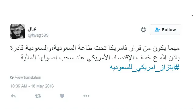 و أبد البعض قناعة بقوة تأثير السعودية على الإقتصاد الأمريكي من خلال بيع سنداتها في الولايات المتحدة، وهو ما قد يؤدي لسحب مليارات الدولارات من الاقتصاد الأمريكي.