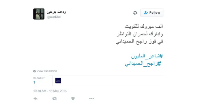 وأحتفل بعض المغردين بفوز الشاعر الكويتي راجح الحميداني بلقب "شاعر المليون" في آخر حلقة من الموسم السابع للبرنامج التلفزيوني "شاعر المليون" و الذي حقق متابعة جماهيرية واسعة في الخليج.