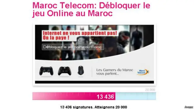 فقد حرر نشطاء مغاربة عريضة على موقع أفاز تحت عنوان "الإنترنت ليست ملكاً لكم، نحن من يدفع ثمنها"، تطالب شركة اتصالات المغرب برفع الحظر عن ألعاب الفيديو عبر الإنترنت.