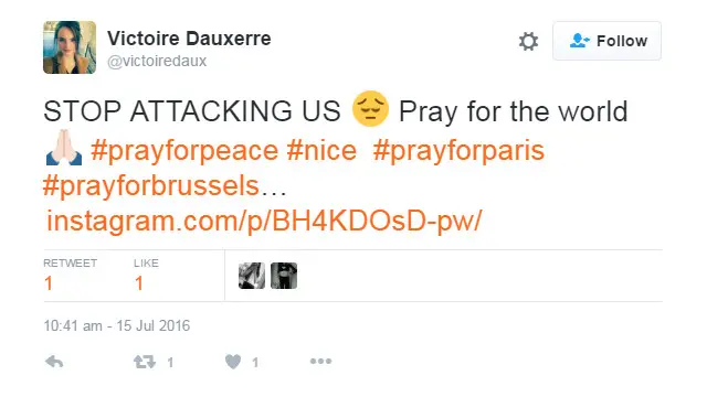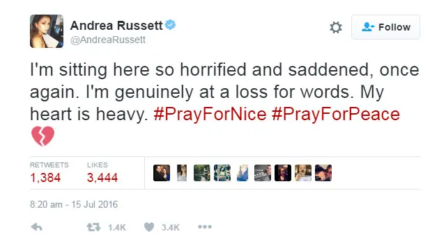 وأطلق مستخدمو وسائل التواصل الاجتماعي هاشتاغ بالإنجليزية بعنوان "PrayforNice" أو صل من أجل نيس الذي حصد حوالي مليوني تغريدة منذ تدشينه صباح اليوم.