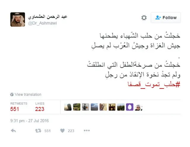 في ظل التطورات الميدانية في مدينة حلب السورية، أطلق مغردون هاشتاغ بعنوان #حلب_تموت_قصفا للتعليق على تدهور الحالة الإنسانية في المدينة.