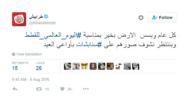 وإلى موضوع آخر إذ دشن مغردون هاشتاغ #اليوم_العالمي_للقطط والذي صادف يوم أمس. وحصد الهاشتاغ أكثر من 15 ألف تغريدة منذ تدشينه صباح اليوم. وانتشر الهاشتاغ في عدد من الدول العربية مثل السعودية والكويت.
