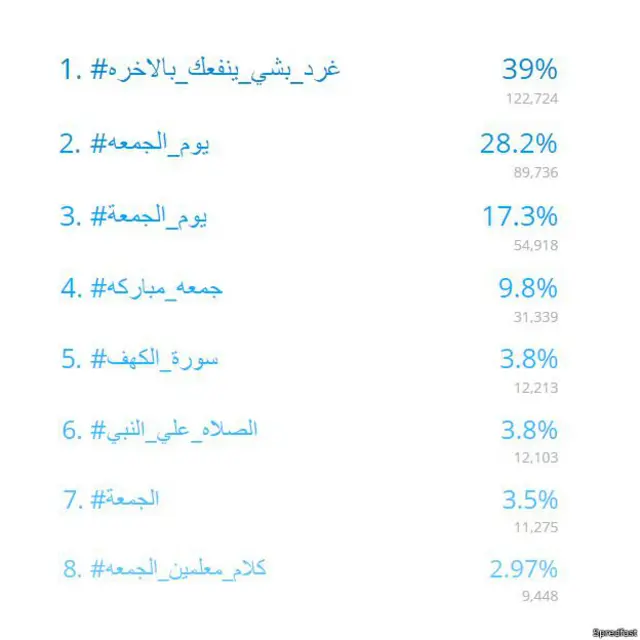 وظهرت هذه الهاشتاغات المختلفة منذ صباح الجمعة وحتى صباح السبت، ووصل عددها إلى 291 ألف تغريدة. واستخدم المغردون هذه الهاشتاغات في عدد من الدول ما أدى إلى انتشار مختلف الأقوال والمصطلحات الدينية على تويتر.