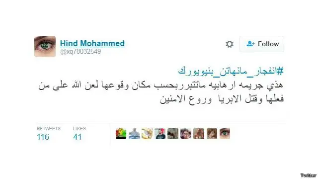 ودشن مغردون عدداً من الهاشتاغات أبرزها #انفجار_مانهاتن_بنيويورك و #نيويورك و #مانهاتن التي ظهرت في نحو 26 الف تغريدة.