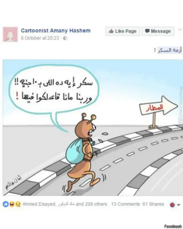 وانتشرت التغريدات الساخرة على تويتر حول أزمة السكر حيث تداول البعض عددا من الكاريكاتورات التي تظهر نملا يبحث عن السكر في البلاد.