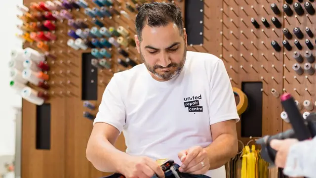 بكري زيتون، خياط سوري وصل إلى هولندا في عام 2018 ، وهو من بين ثمانية لاجئين آخرين يعملون خياطين في هذا المركز الذي تأسس في العام الماضي، للمساعدة في إطالة عمر الملابس من خلال إصلاح ملابس المحلات التجارية المعروفة وزبائنها.
