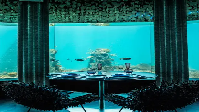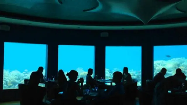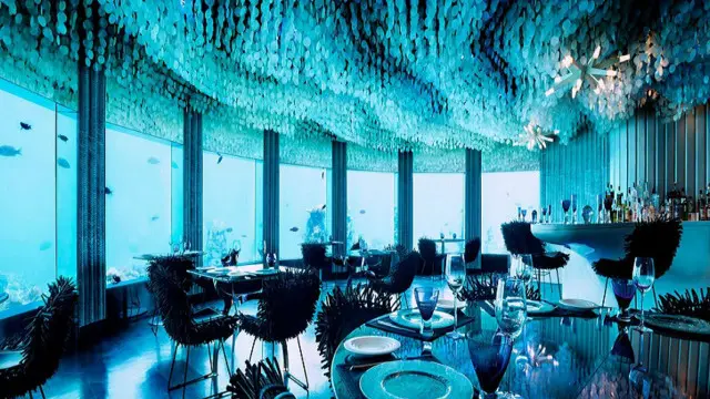 أما في جزيرة "كونراد مالديفز رانغالي" فبإمكانك تناول العشاء أو الغداء تحت الماء دون أن تبتل، مع رؤية جيدة لأسماك القرش وغيرها من مختلف أنواع الأحياء البحرية تسبح من حولك.