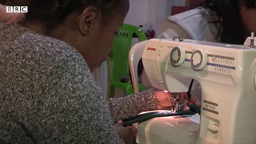 ومع وصول التيار، بدأن بأخذ قياسات الأقمشة والرسم والتسطير والقص والخياطة، والهدف صناعة حقائب يد أو حقائب هاتف.
