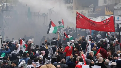 ألقت قوات الأمن اللبنانية قنابل مسيلة للدموع لتفريق المحتجين الذين كان أغلبهم يرشقها بالحجارة ويلوح بأعلام فلسطينية بالقرب من مجمع السفارات في العاصمة اللبنانية بيروت.