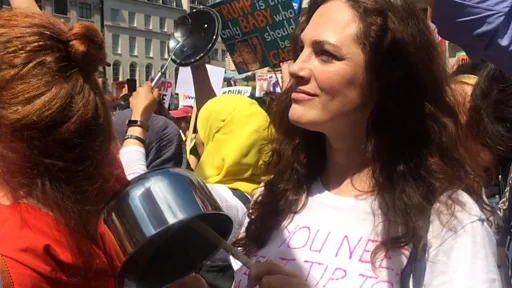 وهن يقرعن على أوان أحضرنها من منازلهن، قالت متظاهرات بريطانيات إن الرئيس ترامب غير مرحب به في إنكلترا فهو "ينشر الخوف، والكراهية، والصراع في أنحاء العالم".