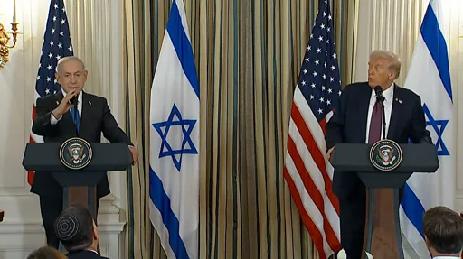 أعلن رئيس الوزراء الإسرائيلي، بنيامين نتنياهو، خلال المؤتمر الصحفي المشترك مع الرئيس الأمريكي، دونالد ترامب، دعمه لخطة ترامب بشأن غزة، معتبراً أنها "تحقق أهداف الحرب عبر إعادة الرهائن، نزع سلاح حماس، إنهاء حكمها السياسي، وضمان بقاء المسؤولية الأمنية بيد إسرائيل، مع إقامة إدارة مدنية لا تديرها حماس ولا السلطة الفلسطينية".